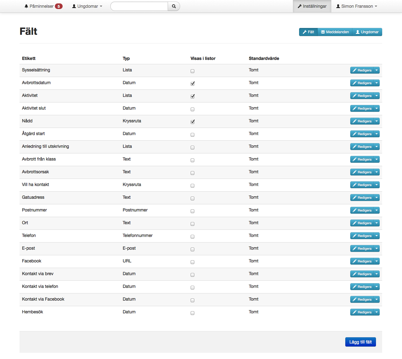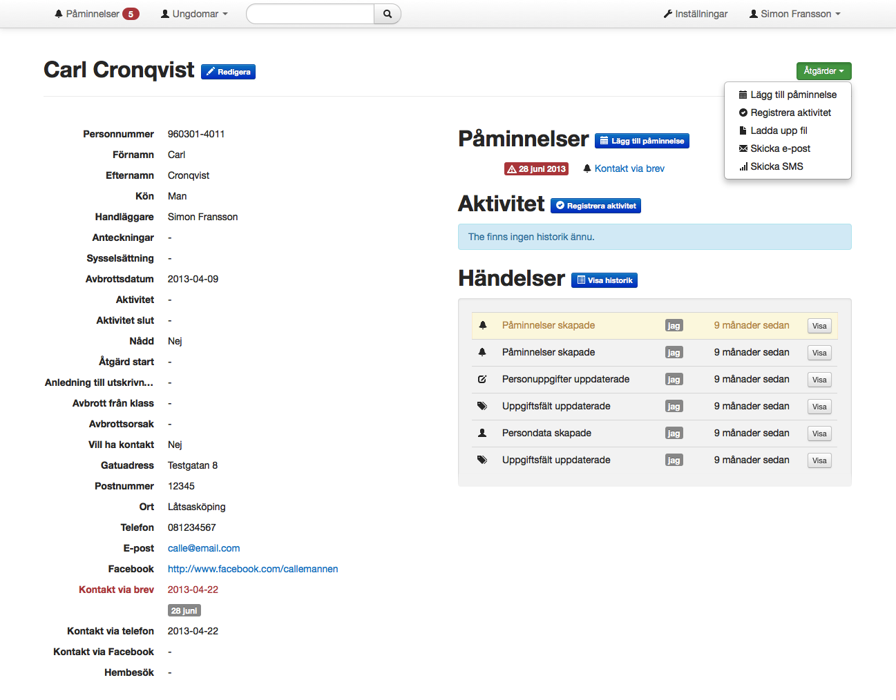 The system, developed in Python/Django, offers an easy way of importing and entering personal data gathered from other instances such as CSN, Skolverket etc. and ensures that the most recent, as well as a historic, records are easily accessible. This is implemented as a sort of versioned data model whose set of fields/attributes changes over time, which proved to be quite a challenging problem. Furthermore the systems aims to be flexible in terms of which types of data can be stored, and offers the possibility to send automated e-mail/text message notifications to the affected persons. The long term project goal is, beside simplified administration and management, is being able to compile statistics on which of the follow up actions that gives the best results.