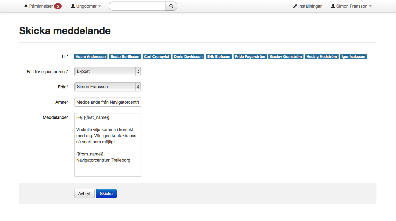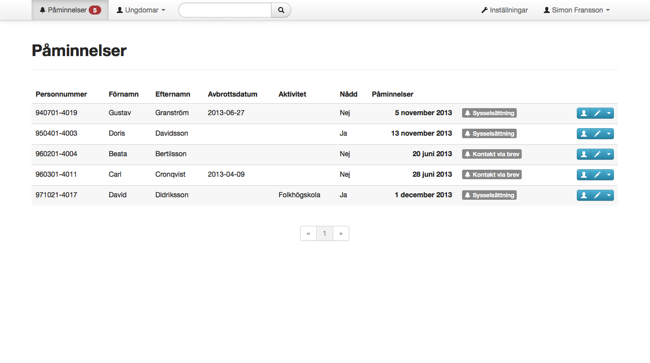 Web based system for storing and administering personal data for youth affected by the KAA law (lagen om kommunalt aktivitetsansvar). The law states that municipalities must be informed of the occupation of all persons between the ages 16 and 19, who are not currently enrolled in a gymnasium education (equivalent or high school), in order to offer them internships, alternative educations etc. Initially developed for Trelleborg municipality, project has subsequently expanded into allowing multiple municipalities to use the same system, and as a consequence is now operated by the organization Sambruk, focusing on joint development and systems usage among municipalities.